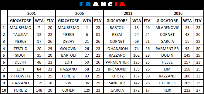 Il primo dato che facciamo notare è la classifica del primo giocatore, sempre vicinissimo alla posizione numero 10, ma negli anni mai tra i primi 5 al mondo. Ad ulteriore testimonianza della mancanza di eccellenza assoluta (anche se è difficile chiamare in modo diverso un top 10) la Francia in campo maschile non vince un torneo dello Slam dal 1983, quando Noah si impose sui campi di casa. In realtà questa mancanza del fuoriclasse assoluto non sembra soltanto una prerogativa degli ultimi decenni. Infatti, prima di Noah, per trovare un altro vincitore di Slam bisogna risalire al 1946, quando Petra e Bernard vinsero nello stesso anno il Roland Garros e Wimbledon.